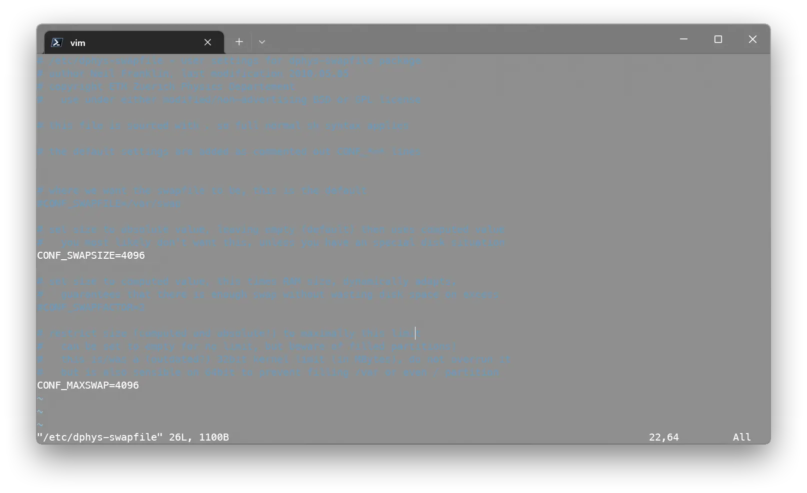 树莓派默认的 swap 非常小,这对于后续运行虚拟机来说,容易出现内存溢出的错误,可以通过编辑/etc/dphys-swapfile文件来修改 swap 大小,这里我改为 4G。