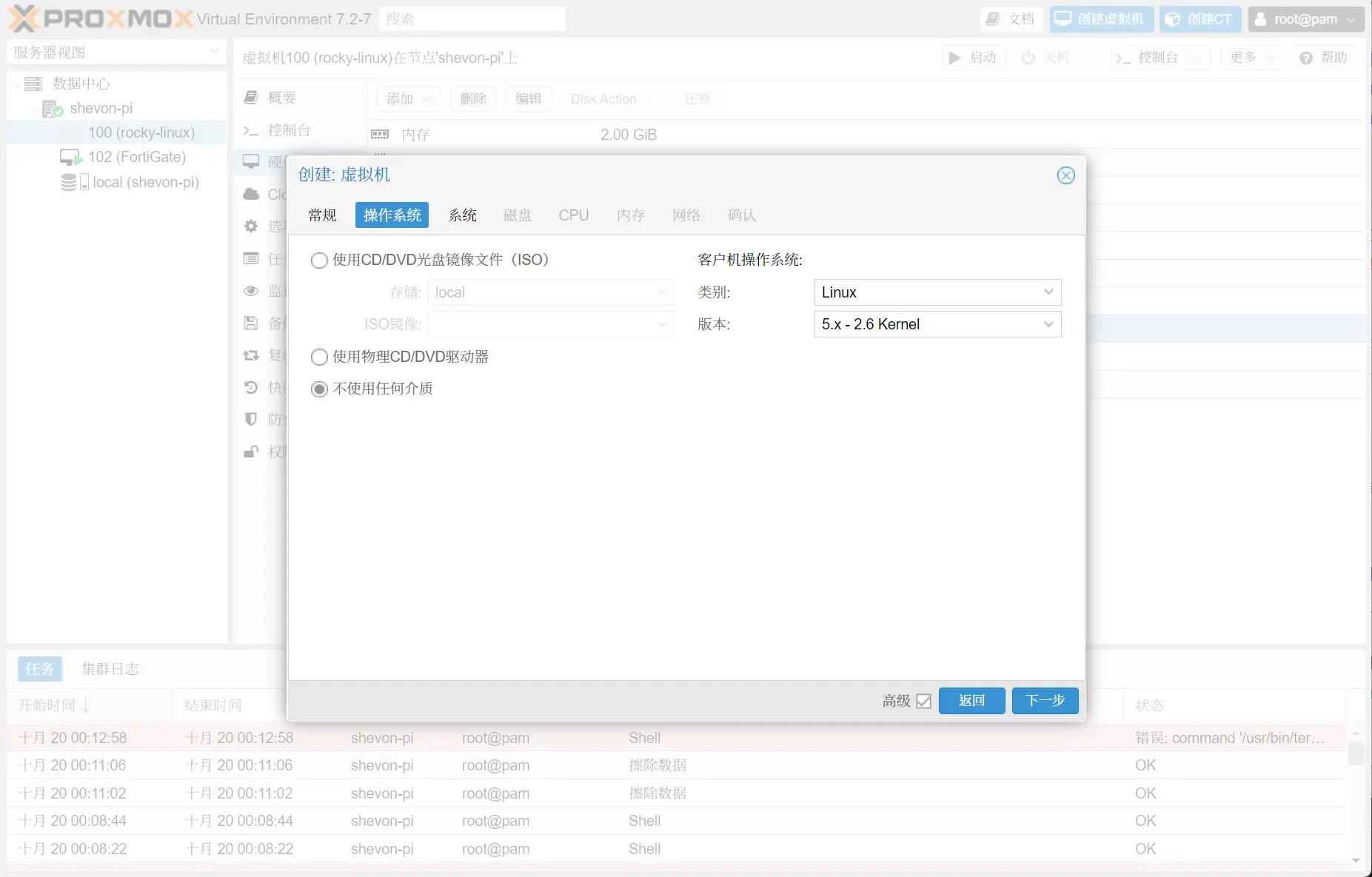 不使用任何介质,这是因为默认的iso文件不是通过scsi驱动的,会导致读取失败,我们将在完成新建以后再添加光驱。