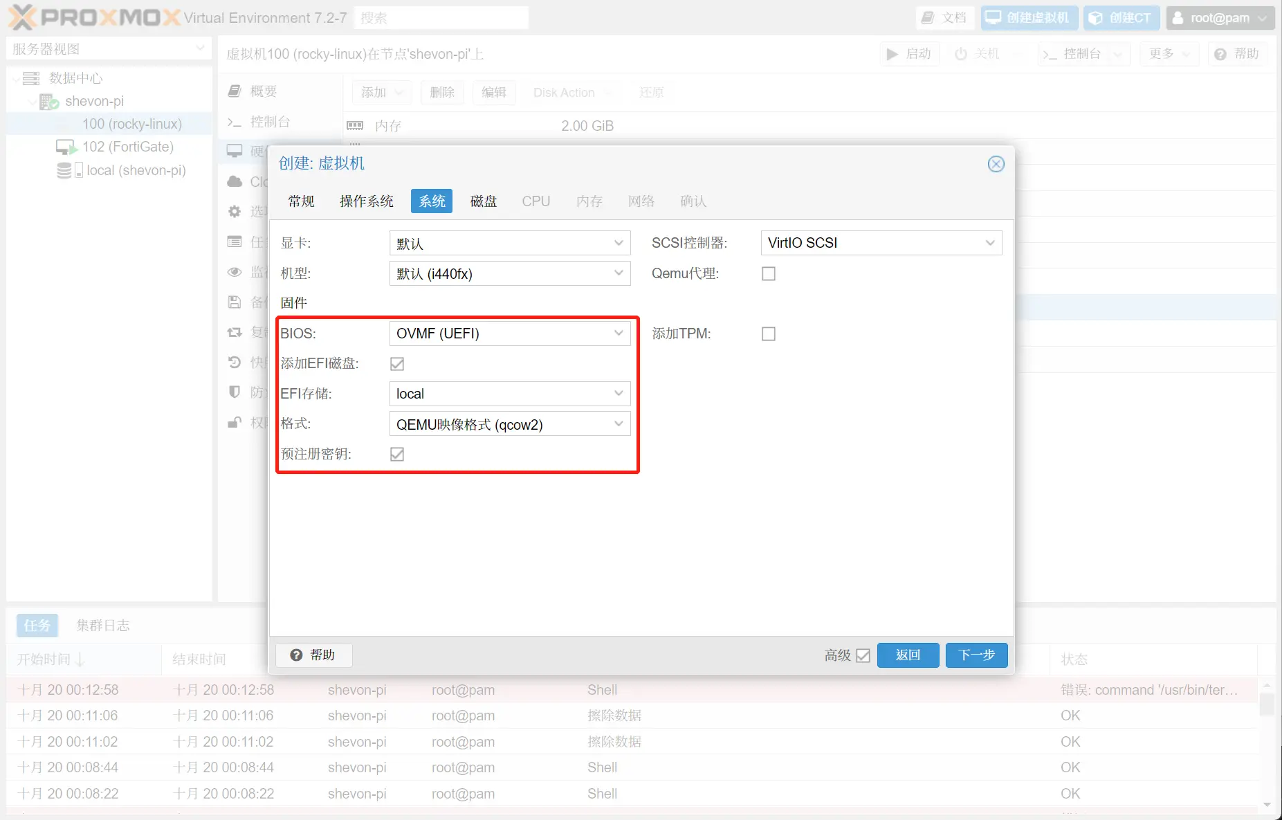 BIOS选项选择OVMF (UEFI)以启用UEFI启动,添加UEFI启动所需的EFI硬盘,这里建议使用qcow2格式以保证性能。