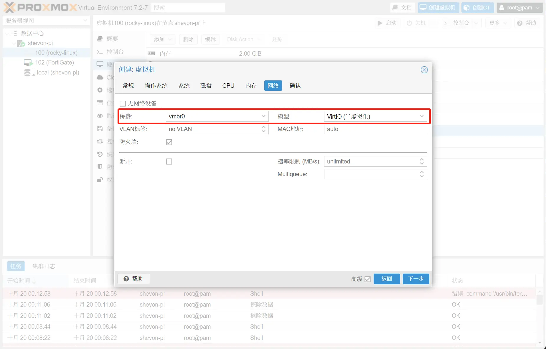 无网络设备,在创建完虚拟机后再添加。VirtIO (半虚拟化)模型拥有比较好的性能和稳定性。